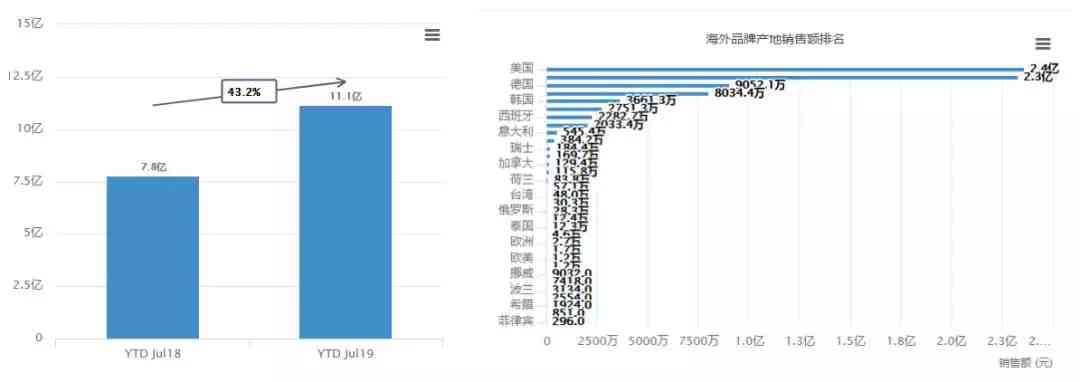 據(jù)Ecdataway數(shù)據(jù)威的數(shù)據(jù)顯示,2019年1-7月,嬰兒護膚線上銷售額達11.1億,同期增長43.2%。其中12.1%的頭部產(chǎn)地貢獻了83.6%的海外品牌銷售額,美國、日本更是以2.4億和2.3億的銷售額處于絕對領先地位。