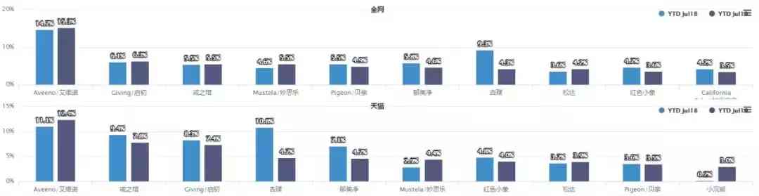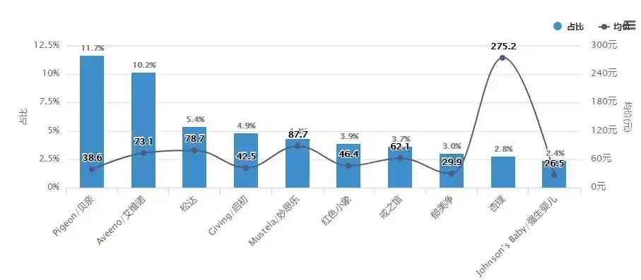 眾所周知,美國有著全球規(guī)模最大的衛(wèi)生保健產(chǎn)品制造商、健康服務提供商——強生公司,強生旗下的嬰兒護膚品牌有艾維諾、強生嬰兒等。從品牌監(jiān)測情況來看,艾維諾、強生嬰兒都是TOP10品牌,其中艾維諾銷售額達1.1億,市場占比10.2%,在天貓平臺上更是達到了量價齊升的態(tài)勢。強生嬰兒雖然份額只有2.4%,但在天貓上銷量已沖到第七位。