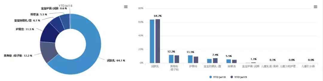 嬰兒護膚產(chǎn)品包括潤膚乳、爽身粉、護臀膏、防曬乳、按摩油、護唇膏、面霜等七個類目。考慮到嬰兒的皮膚很嬌嫩,又容易出現(xiàn)問題,需要精心呵護,所以潤膚乳最受媽媽們歡迎,市場占比64.1%,同期增長0.6%,遠超于其他類目。