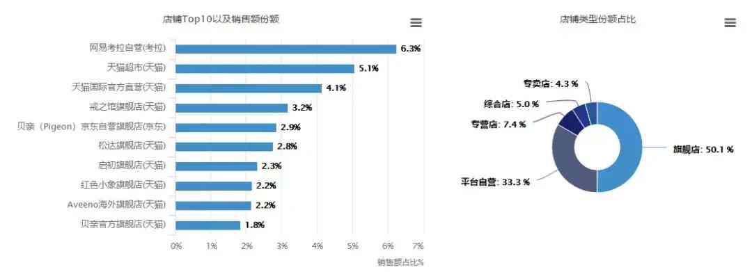 從嬰兒護膚品店鋪銷售情況可以看到,主要銷售額來自旗艦店和自營店,其中旗艦店占比50.1%,平臺自營占比33.3%。TOP10店鋪中網(wǎng)易考拉自營(考拉)份額最高,達 6.3%??梢?,消費者購物時不論是價格還是渠道,都更看重商品的安全性和專業(yè)性。