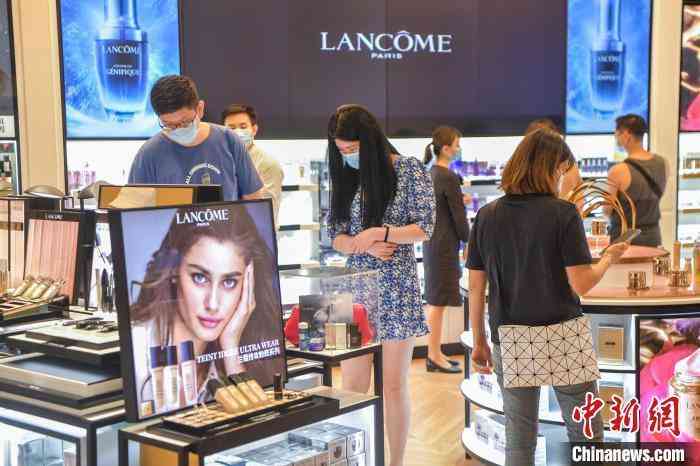 游客在??谌赵聫V場(chǎng)免稅店內(nèi)選購化妝品。 駱云飛 攝