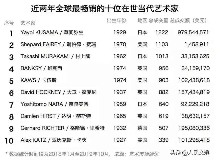 2019年11月發(fā)布的《全球暢銷在世當代藝術家市場報告》顯示,在“近兩年全球最暢銷的十位在世當代藝術家”排行榜中,村上隆以1013件作品收獲3315.36萬美元的總成交額,位列榜單第三。