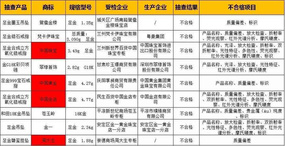 近日,甘肅省市場(chǎng)監(jiān)督管理局發(fā)布“關(guān)于甘肅省2019年第2批工業(yè)產(chǎn)品質(zhì)量省級(jí)監(jiān)督抽查結(jié)果通報(bào)”,本次監(jiān)督抽查了251家企業(yè)的362批次產(chǎn)品,其中抽檢50批次貴金屬首飾及制品,9批次不合格,其中周大生、中國(guó)黃金、中國(guó)珠寶、中國(guó)金店等品牌上榜。