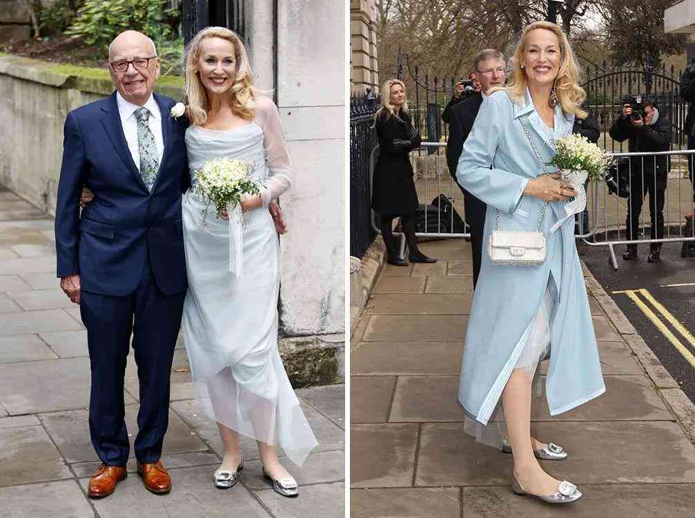和默多克結(jié)婚時(shí),她的Vivienne Westwood藍(lán)色連衣裙也很美。既有婚紗的隆重,廓形也很輕松隨意,搭配同色系長(zhǎng)外套,以及Roger Vivier平底鞋、Chanel包包,非常搶鏡。