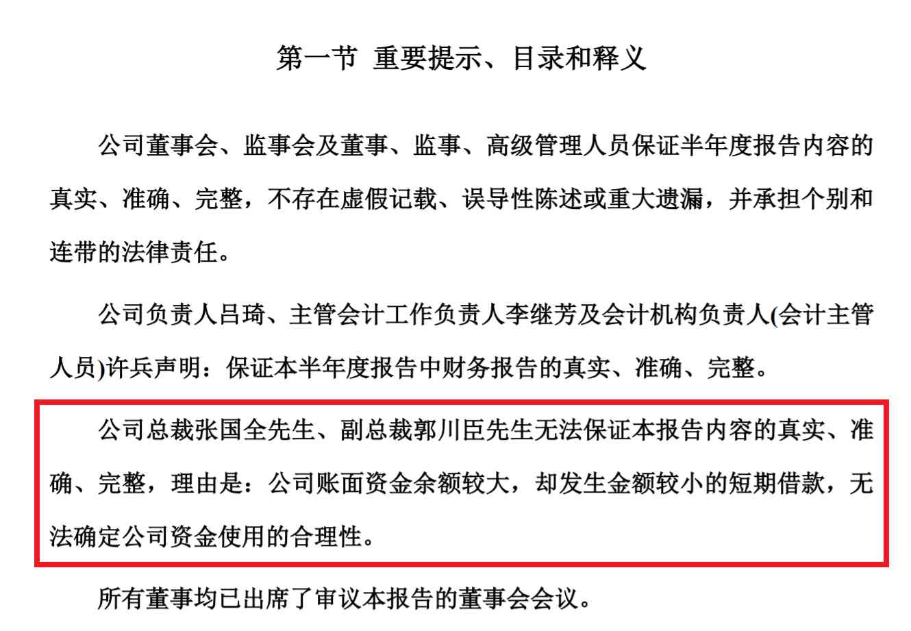 即使這份“扭盈為虧”的財(cái)報(bào)仍遭到了管理層質(zhì)疑。在半年報(bào)中,公司總裁張國(guó)全和副總裁郭川臣提示道:“無(wú)法保證本報(bào)告的真實(shí)、準(zhǔn)確、完整,理由是:公司賬面資金余額較大,卻發(fā)生金額較小的短期借款,無(wú)法確定公司資金使用的合理性?!?/p>