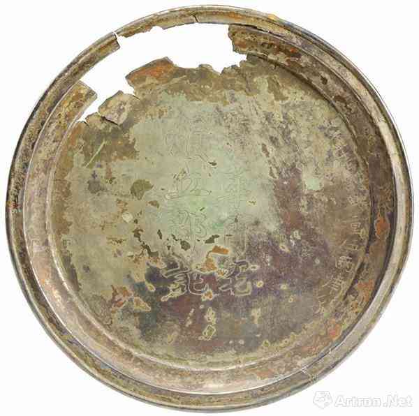銀盤 高1厘米,口徑16.6厘米,底徑13.1厘米。在內(nèi)底雙鉤線刻“葛華甫宅頓丘郡記”