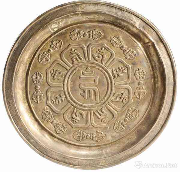 銀盤 高1.2厘米,口徑16.8厘米,底徑13.8厘米。內(nèi)里鑄梵文種子字和金剛杵
