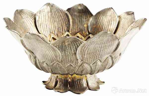 蓮花形銀盞 整體為蓮花形,高4.6厘米,口徑8.7厘米,底徑3.9厘米。十二曲菱花形口