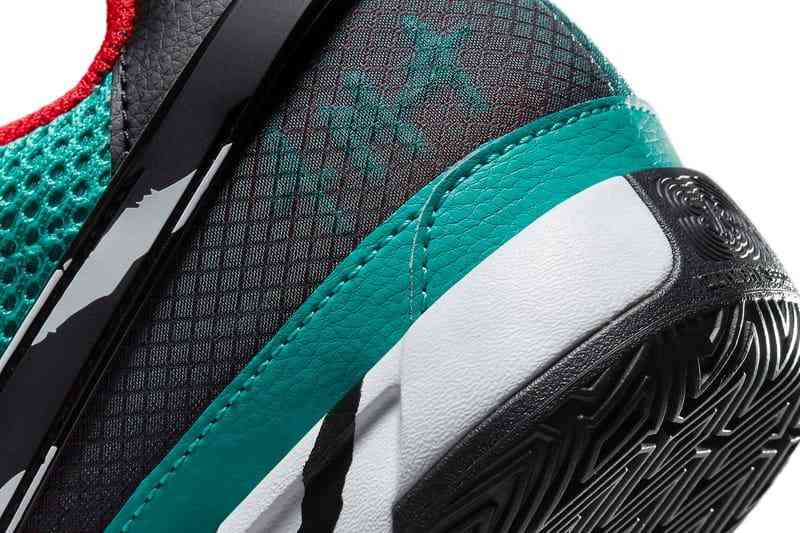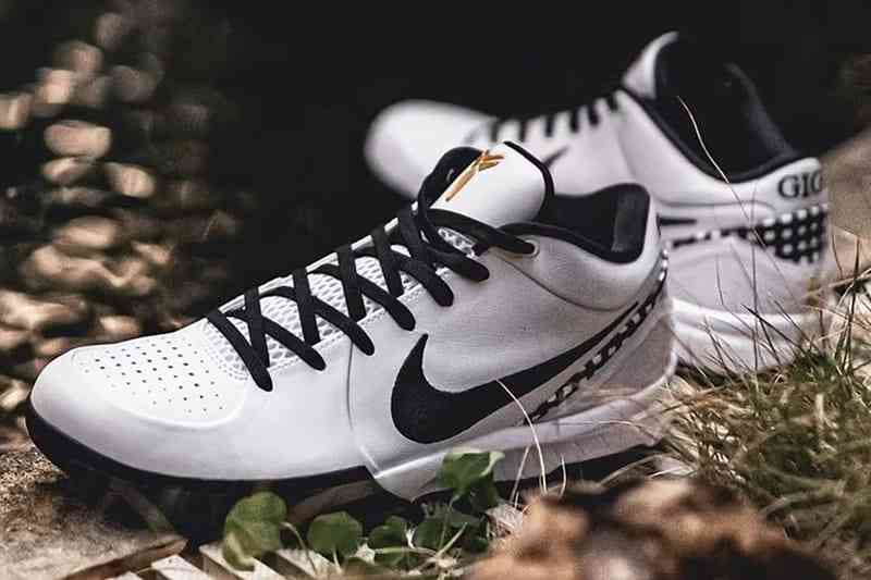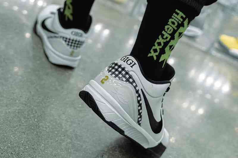 全鞋設(shè)計上以Gianna Bryant 生前隊伍AAU 代表性的黑白配色作主軸,細節(jié)處能夠看到鞋跟處繡上GIGI 字樣,搭配2 號燙金字樣與延伸至鞋面的格紋圖案,鞋跟護邊位置附有Kobe 手寫簽名浮雕,鞋舌處的Kobe 標(biāo)志則同樣以燙金呈現(xiàn)。
