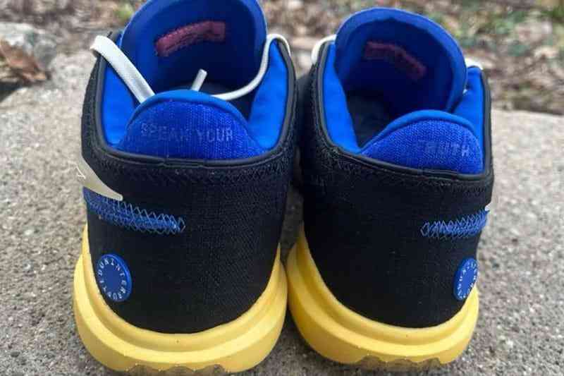 全鞋設(shè)計上源自UNINTERRUPTED 的官方配色,以黑色帆布鞋面搭配藍色的底層Swoosh Logo、內(nèi)里、縫線,細節(jié)處包括鞋跟UNINTERRUPTED 與SPEAK YOUR TRUTH 標(biāo)志,仿舊的泛黃色中底前段也有UNINTERRUPTED 壓印,最后搭載透明外底與兩腳手寫SPEAK TRUTH 字樣。