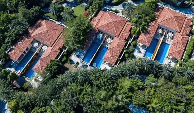 酒店分為兩大板塊,我們?nèi)胱〉氖窍瞾淼嵌燃倬频?,而這一邊是精選酒店,不同之處在于格調(diào)更高,獨(dú)立的小別墅帶私人泳池,從空中看過去更添一份美感。