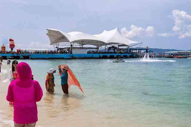 碼頭下來的右側(cè)便是游玩區(qū),水上漫步、摩托艇等常規(guī)項(xiàng)目便是在這里進(jìn)行,岸邊有沙灘躺椅和小圓屋提供給游客使用,拍照出來的效果特別好看。