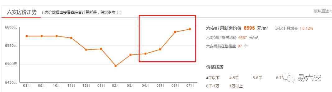 根據(jù)安居客數(shù)據(jù)顯示,自今年3月以來(lái),六安新房均價(jià)就一直呈現(xiàn)上漲的趨勢(shì),其中5月至6月呈跳躍式上漲,7月的新房均價(jià)為6569元/㎡,環(huán)比上月增長(zhǎng)0.12%。