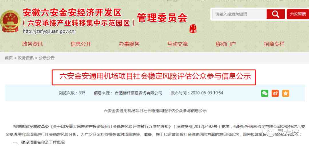 6月3日,六安金安通用機(jī)場(chǎng)項(xiàng)目社會(huì)穩(wěn)定風(fēng)險(xiǎn)評(píng)估公眾參與信息公示,意味著距離金安機(jī)場(chǎng)建設(shè)又近了一步!