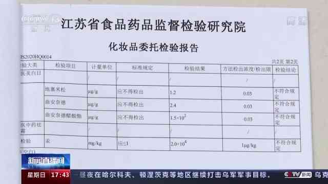 江蘇省新沂市場監(jiān)管局稽查科科長 尹蕾:日霜檢驗出來三種激素,分別為曲安奈德、曲安奈德醋酸酯、地塞米松,這是我們國家明令禁止添加的。另外就是老中醫(yī)的那個晚霜里面,我們還檢測出來汞,按照我們國家規(guī)定含量是小于等于1毫克每千克的,但是在該產(chǎn)品檢出來的汞,結果是2萬倍。