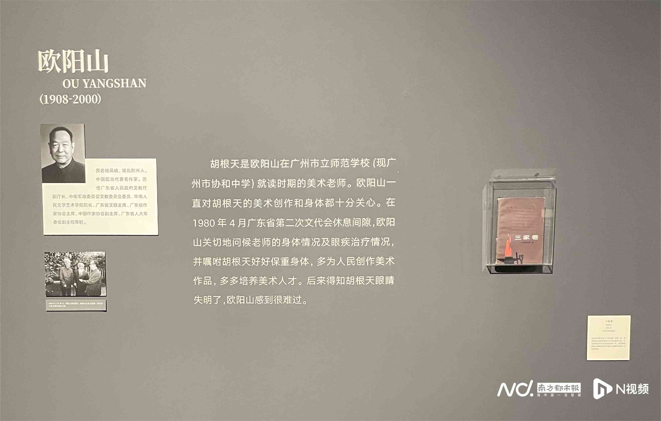 胡根天是歐陽山在廣州市立師范學校(現(xiàn)廣州市協(xié)和中學)就讀時期的美術老師。歐陽山一直對胡根天的美術創(chuàng)作和身體都十分關心。在1980年4月廣東省第二次文代會休息間隙,歐陽山關切地問候老師的身體情況及眼疾治療情況,并囑胡根天好好保重身體,多為人民創(chuàng)作美術作品,多多培養(yǎng)美術人才。后來得知胡根天眼睛失明了,歐陽山很難過。
