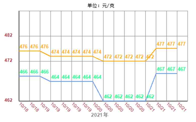 2021年10月21日國(guó)際黃金價(jià)格1783.66美元/盎司,國(guó)內(nèi)黃金價(jià)格368元/克,香港金價(jià)19130港幣/兩,黃金回收價(jià)格363元/克,中國(guó)黃金基礎(chǔ)金價(jià)368.1元/克,周大福黃金價(jià)格477元/克(漲5元),六福黃金價(jià)格477元/克(漲5元),周生生黃金價(jià)格476元/克(漲5元),老鳳祥黃金價(jià)格478元/克(漲2元),老廟黃金價(jià)格475元/克(漲4元),菜百今日金價(jià)472元/克(平),周大生金價(jià)477元/克(漲5元),以上黃金報(bào)價(jià)僅供參考。