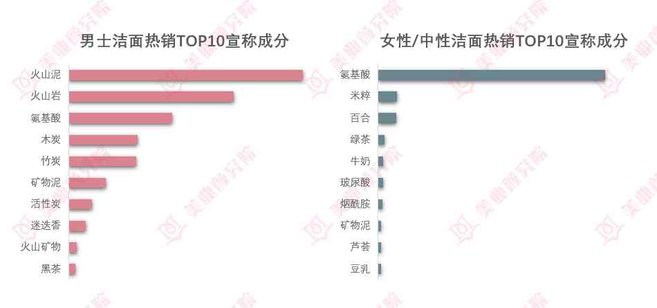 男士潔面市場火山泥成為最熱門的宣稱成分,氨基酸排名第三。男士潔面市場氨基酸潔面銷量占比僅為7%,氨基酸主打溫和清潔,原料成本較高,相比而言清潔力更強的火山泥、火山巖、木炭等成分更受到男性消費者的歡迎,這也是為什么女性/中性潔面市場的銷售均價更高的緣故。