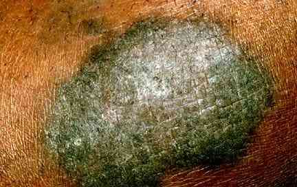 那塊硬殼,就像凍瘡很久之后留下的厚殼,不過手感更皮實粗糲,棕紅色也已變?yōu)榘岛稚?/span>最開始的丘疹變厚之后,已經(jīng)融成了一片,看上去就像“苔蘚”。