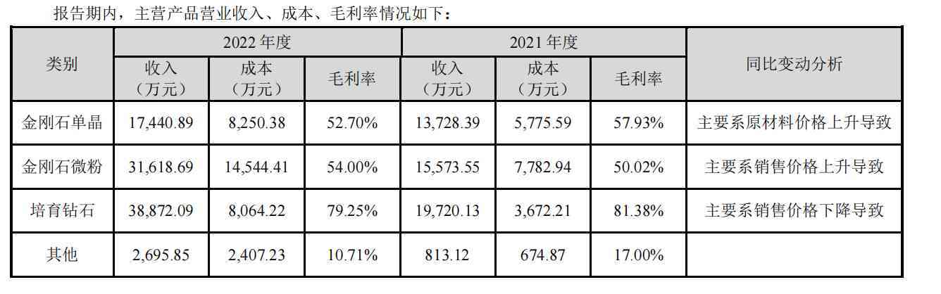 其中,培育鉆石已經(jīng)成長(zhǎng)為公司的大業(yè)務(wù)。從營(yíng)業(yè)收入構(gòu)成上看,培育鉆石占營(yíng)收比例達(dá)42.89%;金剛石微粉成為主營(yíng)業(yè)務(wù)中,營(yíng)收增幅增長(zhǎng)最大的板塊,同比上漲103.03%。