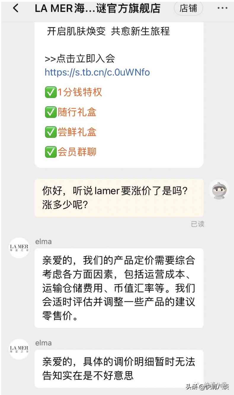 7月11日,小八就漲價(jià)向海藍(lán)之謎官方旗艦店客服求證,其表示:產(chǎn)品定價(jià)需要綜合考慮各方面因素,包括運(yùn)營成本、運(yùn)輸倉儲(chǔ)費(fèi)用、幣值匯率等,我們會(huì)適時(shí)評(píng)估并調(diào)整一些產(chǎn)品的建議零售價(jià)。具體的調(diào)價(jià)明細(xì)暫時(shí)無法告知。