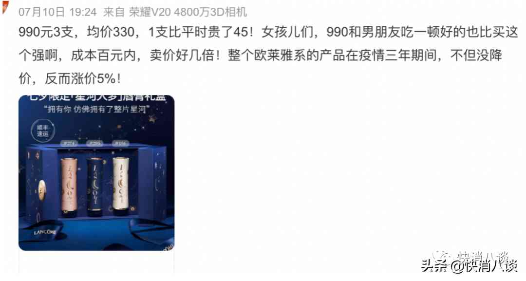 還有網(wǎng)友稱“早知道多囤幾瓶了”“還是在免稅店買,旗艦店好貴”“還沒等到我漲工資,海藍(lán)之謎就離我越來越遠(yuǎn)了”……