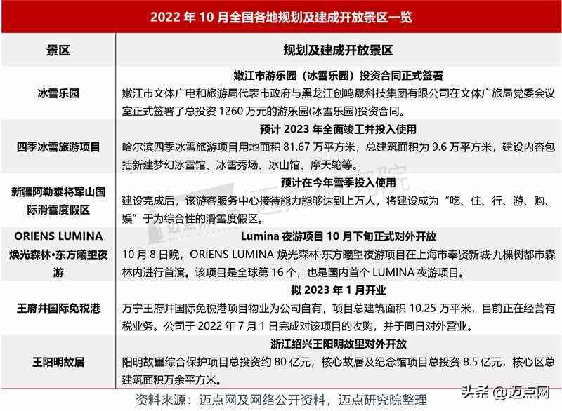 3. 景區(qū)規(guī)劃拓展:10月,為搶占黃金市場,升級景區(qū)產(chǎn)品體驗,各地景區(qū)單位加強戰(zhàn)略投資規(guī)劃,涌現(xiàn)項目建設(shè)熱潮。上海Lumina夜游項目10月下旬正式對外開放;萬寧王府井國際免稅港擬2023年1月開業(yè)。