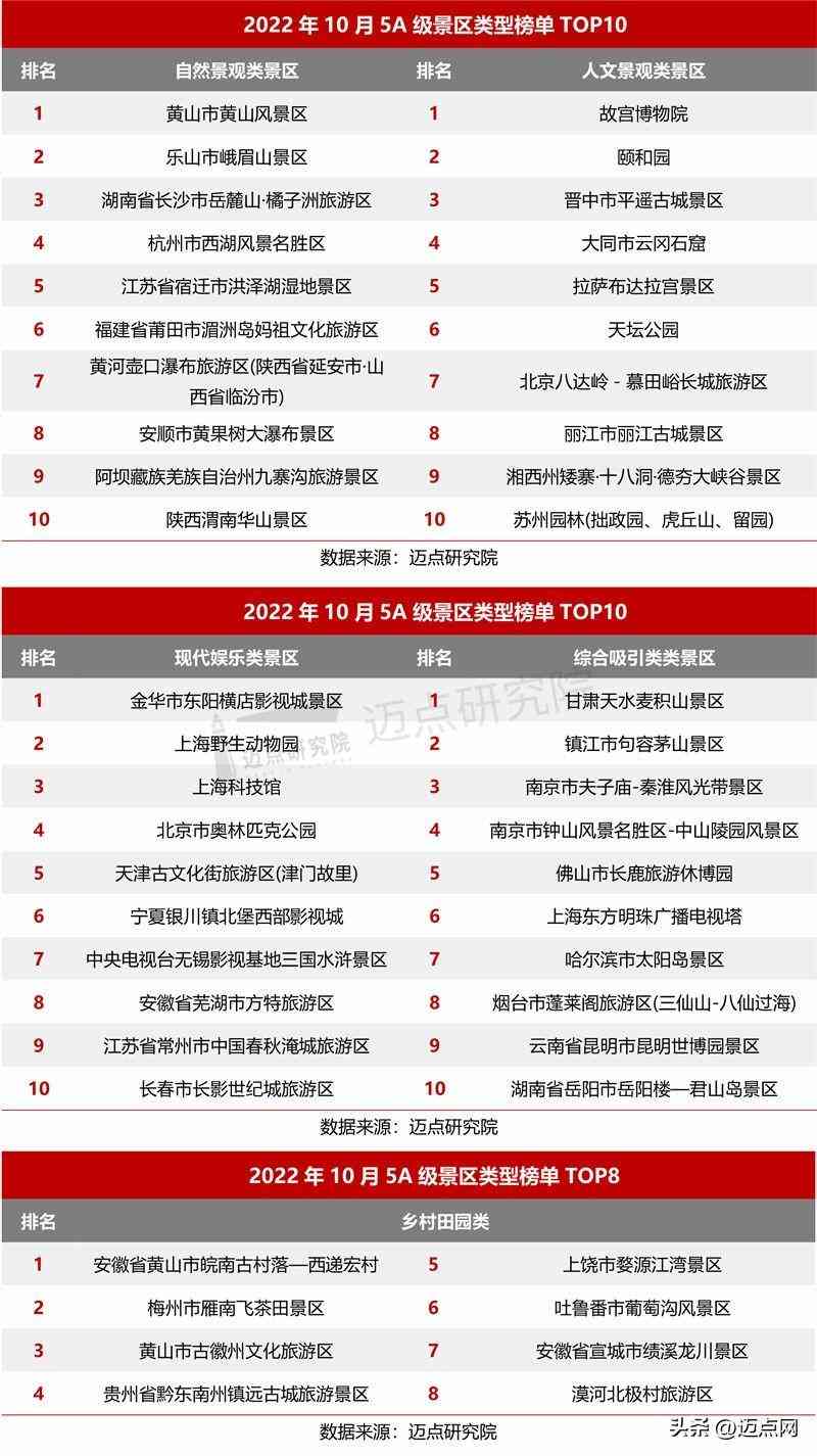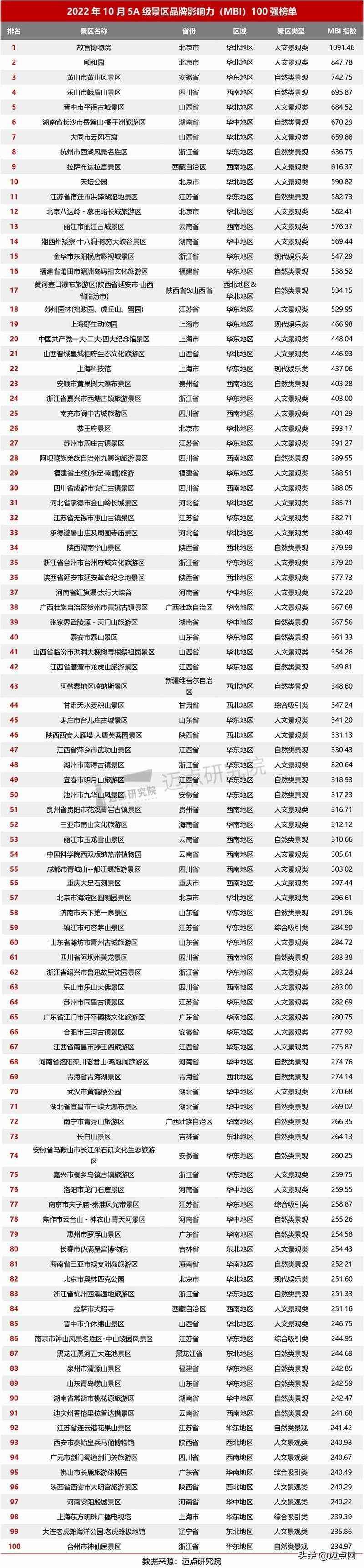 以下是邁點研究院發(fā)布“2022年10月5A級景區(qū)品牌影響力(MBI)100強榜單”。 10月,故宮博物院、頤和園、黃山市黃山風(fēng)景區(qū)表現(xiàn)搶眼位列前三甲,樂山市峨眉山景區(qū)、晉中市平遙古城景區(qū)、湖南省長沙市岳麓山·橘子洲旅游區(qū)、大同市云岡石窟、杭州市西湖風(fēng)景名勝區(qū)、拉薩布達(dá)拉宮景區(qū)、天壇公園躋身榜單前十。
