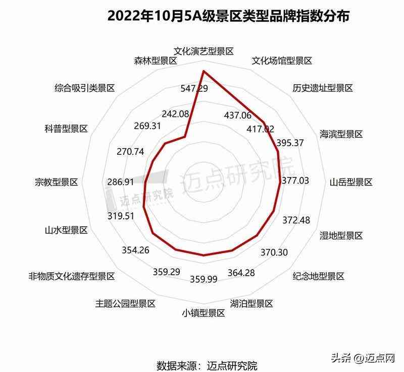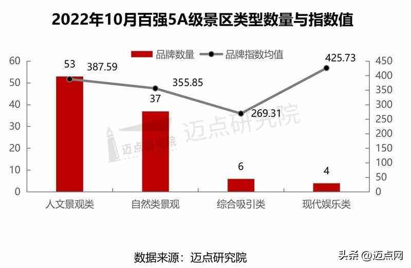 5A級景區(qū)百強榜單中,人文景觀、自然景觀依舊穩(wěn)居冠亞軍,分別上榜53和37個5A級景區(qū);細(xì)分類型中,以歷史遺址型景區(qū)、山岳型景區(qū)、小鎮(zhèn)型景區(qū)為主,分別占據(jù)32、15、11個席位。從品牌指數(shù)來看,10月5A級景區(qū)各類型中品牌指數(shù)由高到低分別為:現(xiàn)代娛樂類(425.73 )、人文景觀類(387.59 )、自然類景觀(355.85 )、綜合吸引類(269.31 )。細(xì)分類型品牌指數(shù)由高到低分別為:文化演藝型景區(qū)(547.29 )、文化場館型景區(qū)(437.06 )、歷史遺址型景區(qū)(417.02 )。