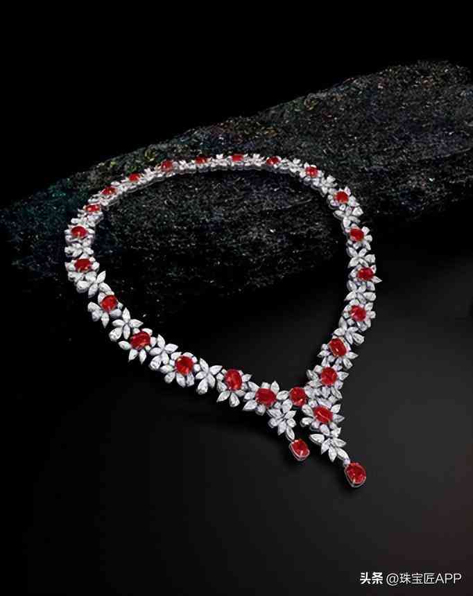 這條項(xiàng)鏈長(zhǎng)度為43.5cm,上面共鑲嵌有25顆總重50.24克拉的枕型緬甸鴿血紅紅寶石,晶體透凈,其中最大的一顆重3.11克拉,周?chē)c(diǎn)綴有65.30克拉的圓形明亮式切割、梨形和馬眼形鉆石,附兩張古柏林證書(shū);