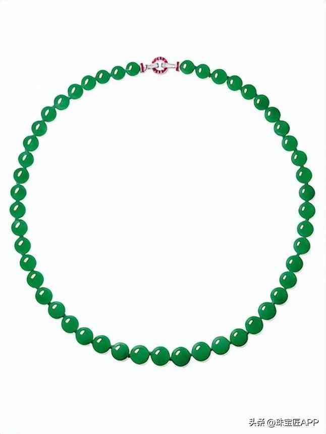 這條翡翠項(xiàng)鏈?zhǔn)怯?9顆色澤翠綠、透明度良好的翡翠珠子組成,配以一顆紅寶石和階梯形切割鉆石表扣;尺寸約為12.35-9.70毫米的翡翠珠子;長(zhǎng)度60.0cm。