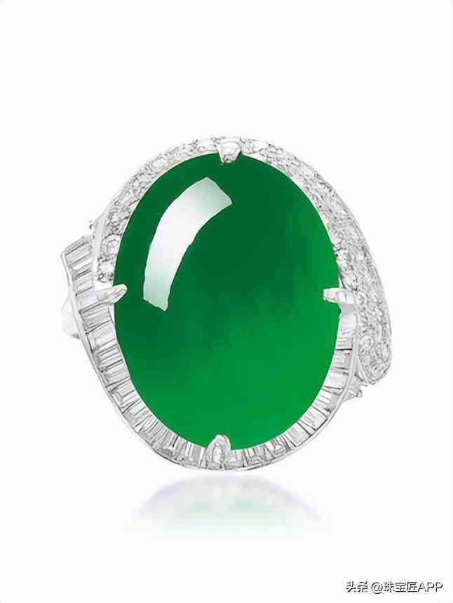 橢圓形翡翠上飾有總重約1.60克拉的長(zhǎng)方形和圓形明亮式切割鉆石;翡翠尺寸約為19.28 x 14.60 x 8.57mm毫米;鉑金鑲嵌;戒指尺寸10;