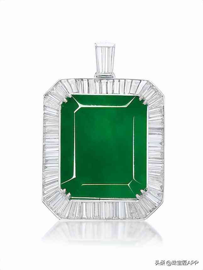 翠綠色的翡翠周?chē)h(huán)繞著延伸至頂部的錐形矩形切割鉆石,鉆石總重約3.45克拉;翡翠尺寸約為23.68 x 19.48 x 4.56mm毫米;18k白金鑲嵌;尺寸4.2 x 2.8cm厘米;