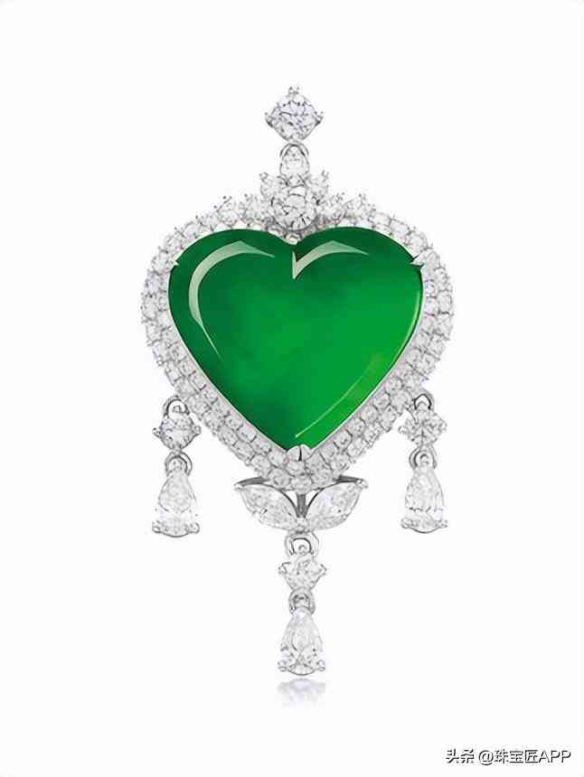 明亮的綠色心形半翡翠,飾有各種切割的鉆石,總重約1.75克拉;尺寸約為16.76 x 19.48 x 1.57mm毫米的翡翠;18k白金鑲嵌;尺寸4.4 x 2.1cm厘米;