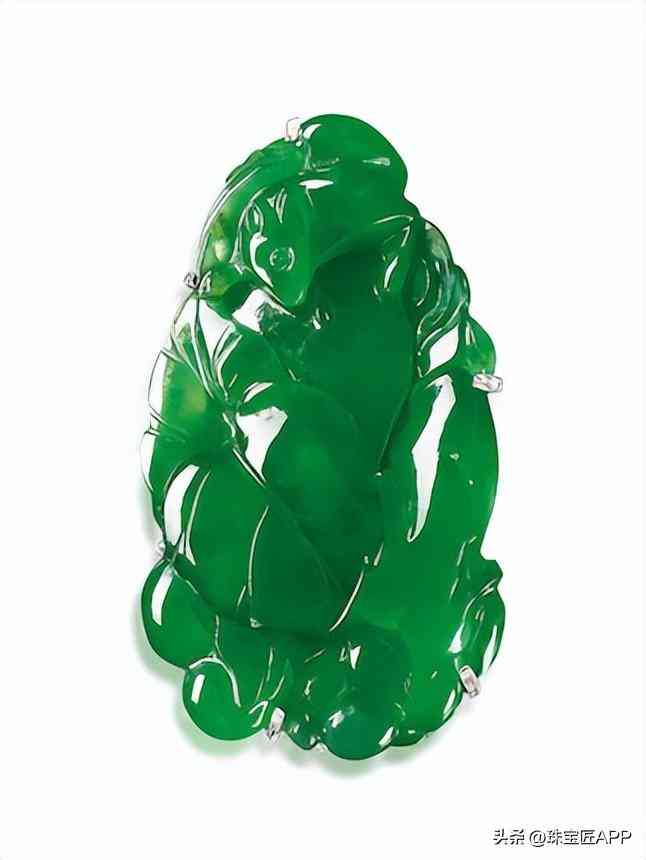 葉狀設(shè)計(jì),鑲有幾塊明亮的翠綠色翡翠,點(diǎn)綴著總重約2.35克拉的長(zhǎng)方形和圓形明亮式切割鉆石;尺寸約為23.02 x 13.56mm毫米;吊墜配件;鉑金鑲嵌;尺寸7.0 x 5.3cm厘米;