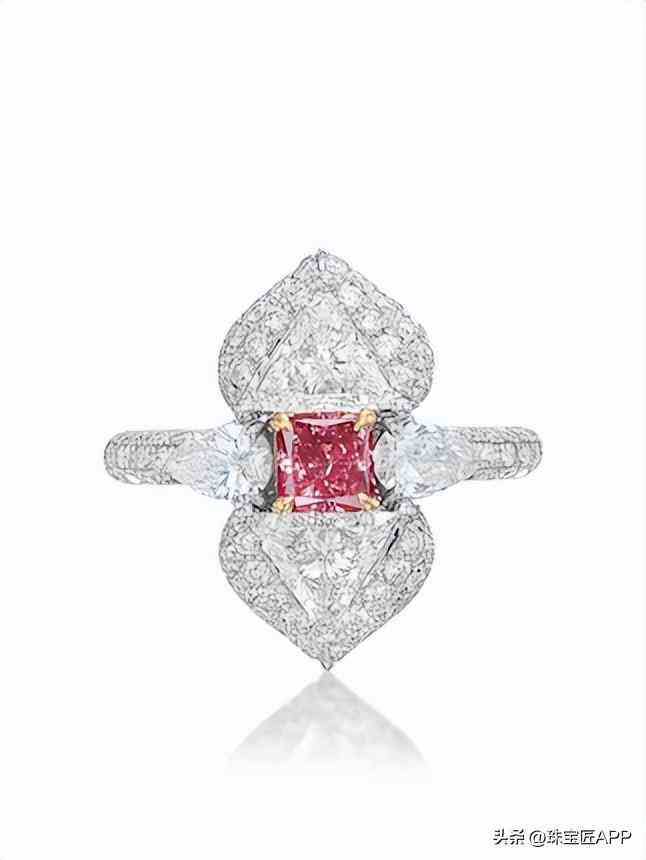 戒指尺寸5,18k白金和黃金鑲嵌,鑲嵌一顆重0.52克拉的方形改良切割紅鉆,周?chē)c(diǎn)綴著總重約2.40克拉的trilliant型、梨形和圓形明亮式切割鉆石;附美國(guó)寶石協(xié)會(huì)證書(shū)和GIA報(bào)告;
