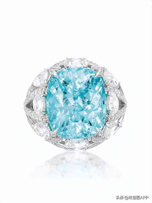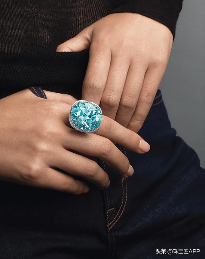 重11.62克拉的枕形帕拉伊巴型碧璽,位于圓形鉆石之間,帶有橢圓形和梨形玫瑰形切割鉆石點(diǎn)綴,鉆石總重約3.20克拉;鉑金鑲嵌;戒指尺寸5;