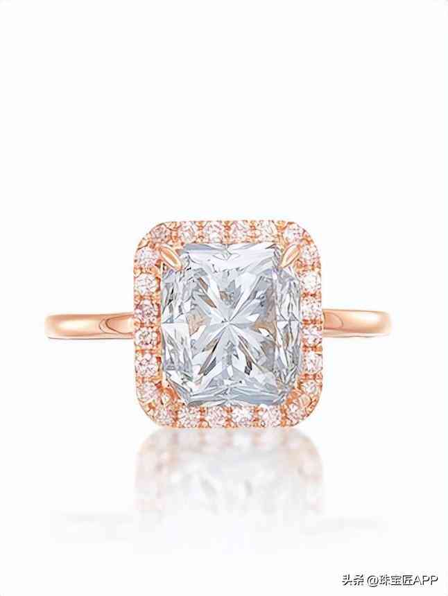 重3.64克拉的矩形明亮式切割淡藍(lán)色鉆石,周?chē)傆蟹凵珗A形明亮式切割鉆石;18k玫瑰金鑲嵌;戒指尺寸5;