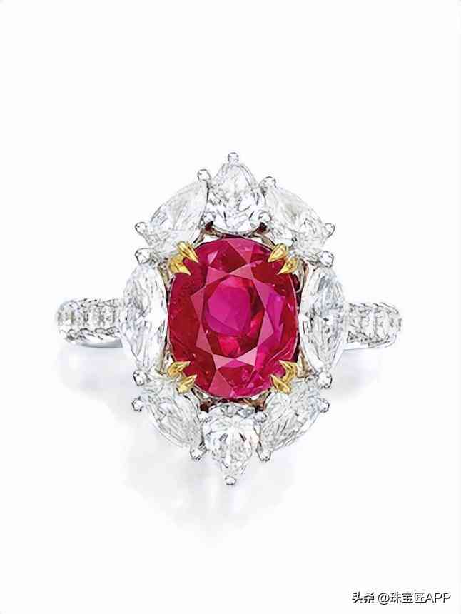 一顆重4.22克拉的橢圓形紅寶石鑲嵌在梨形和馬眼形鉆石之間,鉆石總重約2.35克拉;18k白金和黃金鑲嵌;戒指尺寸6;