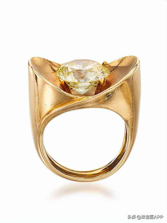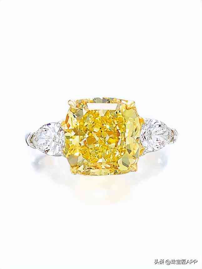 枕形濃彩黃鉆,重5.70克拉,兩側(cè)鑲有各重0.40克拉的梨形鉆石;18k黃金和鉑金鑲嵌;戒指尺寸5;