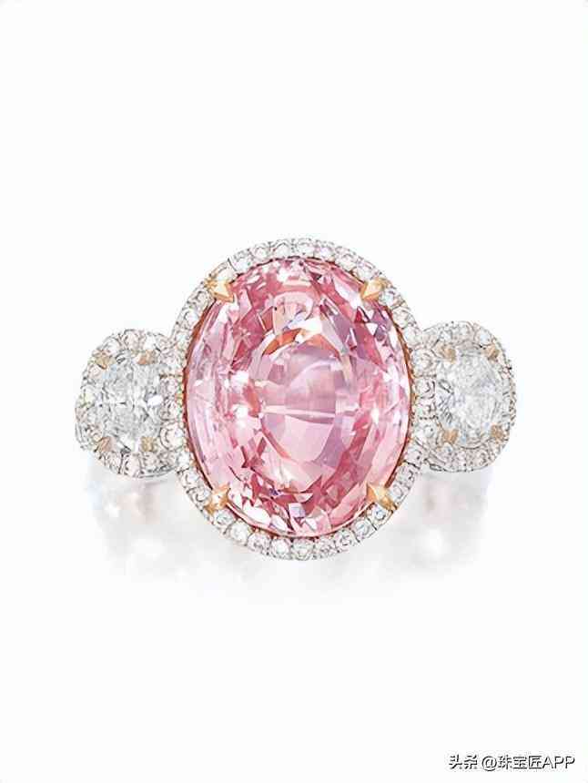 重8.71克拉的橢圓形padparadscha藍(lán)寶石,鑲嵌在兩顆橢圓形鉆石之間,周?chē)h(huán)繞一圈明亮式切割鉆石,鉆石總重約2.60克拉;18k白金鑲嵌;戒指尺寸7;