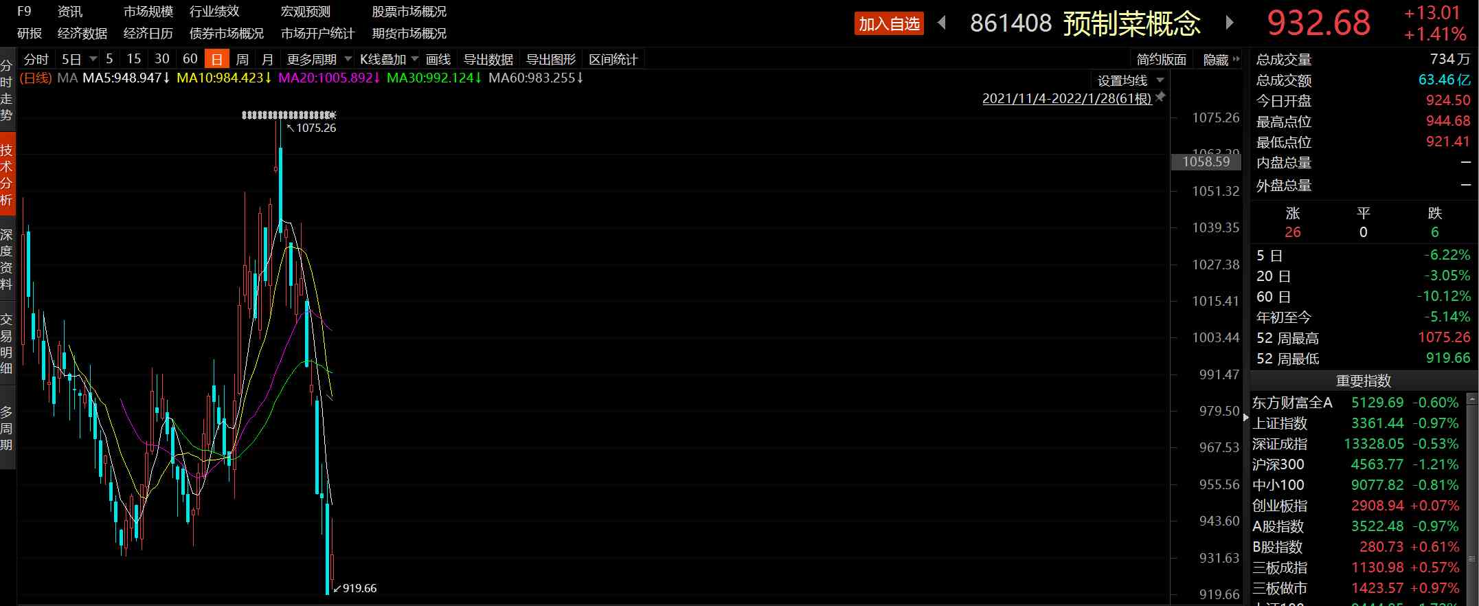 目前,從指數(shù)來(lái)看,預(yù)制菜概念板塊行情已然開始回落,從1月13日的1059.69點(diǎn),降至1月28日的932.68點(diǎn)。