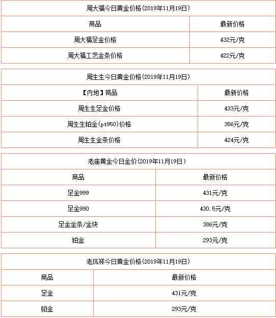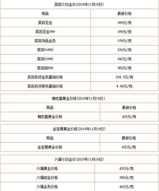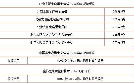 :2019年11月19日今日黃金價格今天多少一克查詢包括:周生生/周大福/六福珠寶/老廟黃金/老鳳祥/菜百/太陽金店/潮宏基/金至尊等品牌999足金價格查詢。
