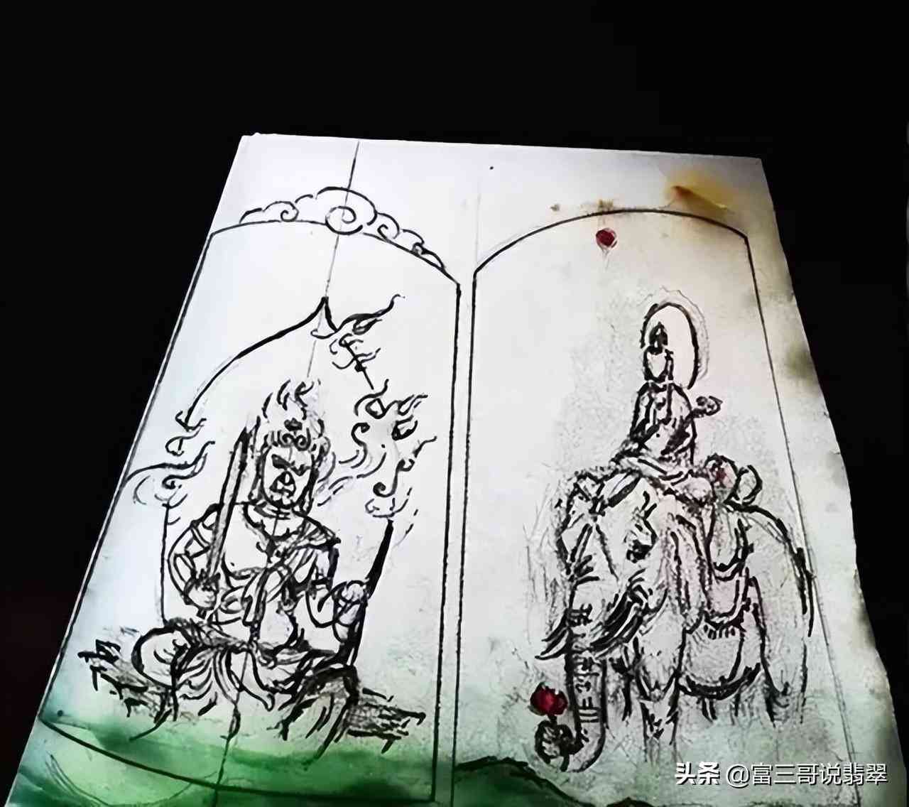 經(jīng)過與客戶反復(fù)溝通與討論,我們最終達(dá)成了一致的設(shè)計(jì)思路:將料子一分為二,翠色做底,做一對(duì)夫妻雙方本命守護(hù)佛。