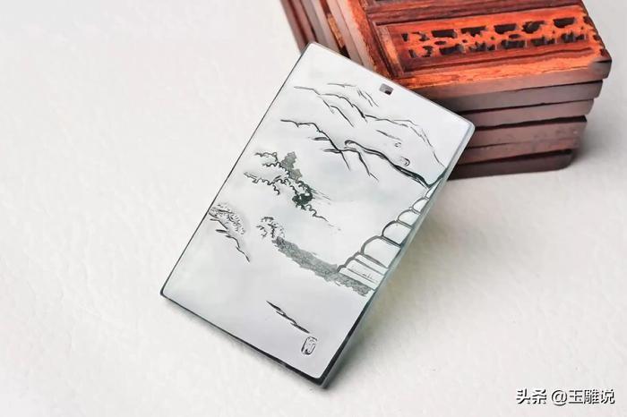 經(jīng)過玉雕師的精心努力雕琢,山水掛件的毛貨總算是完成了。原石上飄著的那些一團團黑黑的色彩,已變成一層層幽綠群山,當初那塊不入人們眼球的毛料,此刻已是人人哄搶的翡翠山水方牌。