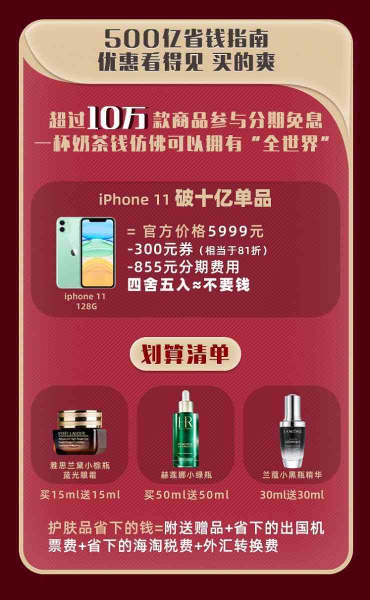 以5999元的iphone 11 128G為例,減去300元券加855元分期費用的綜合優(yōu)惠,這款心儀手機(jī)的到手價簡直低得可怕。再看一個數(shù)據(jù),iPhone 11一分鐘成交即破億,結(jié)合前面的數(shù)據(jù)來看,消費者買的越多省得就越多。