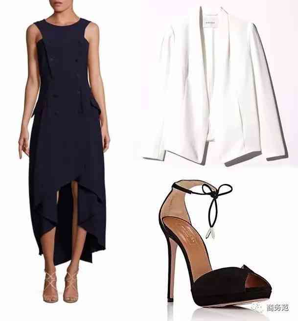 黑色長(zhǎng)裙來自意大利設(shè)計(jì)師品牌Antonio Berardi,采用雙排扣裝飾及不規(guī)則下擺設(shè)計(jì),售價(jià)約7362人民幣;白色西裝來自溫哥華品牌Aritzia,售價(jià)約1331人民幣;魚嘴腳踝綁帶高跟鞋來自意大利品牌Aquazzura,售價(jià)約2587人民幣↓