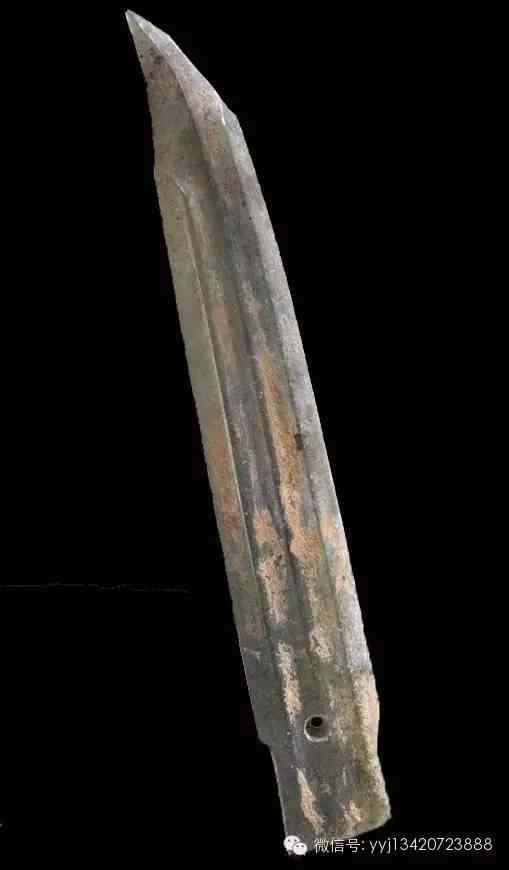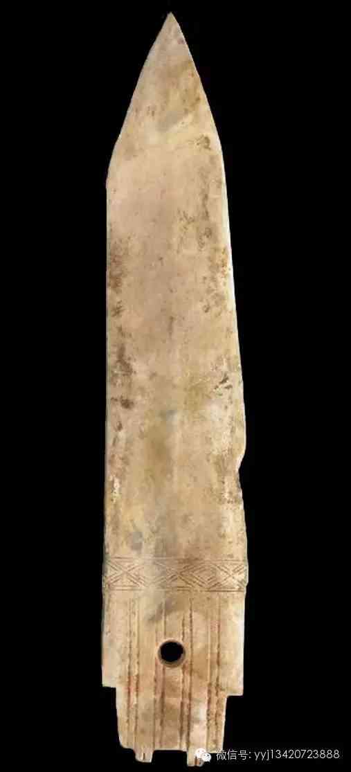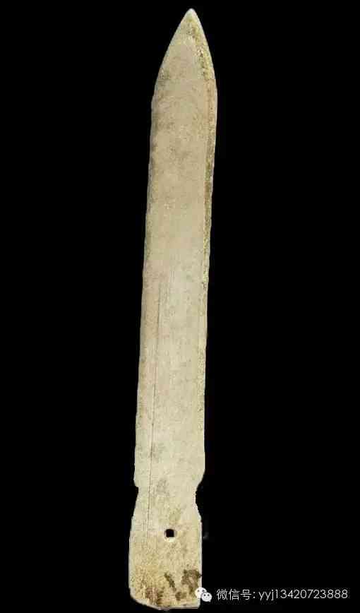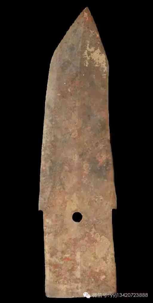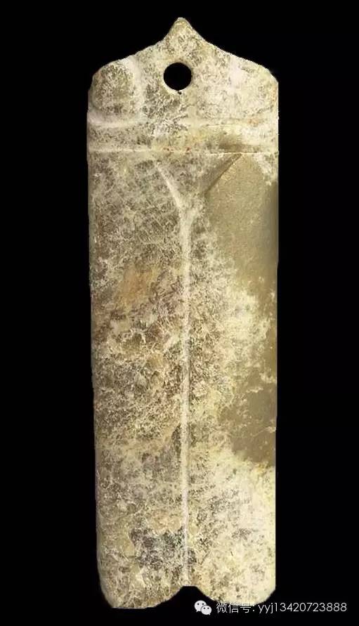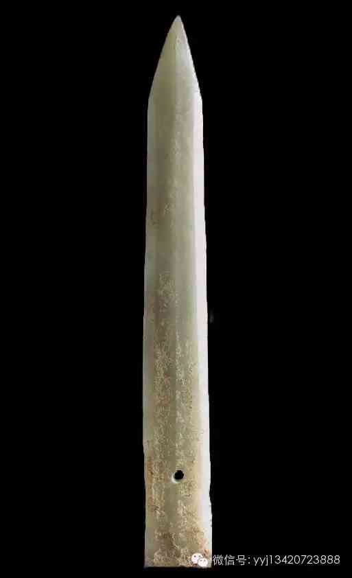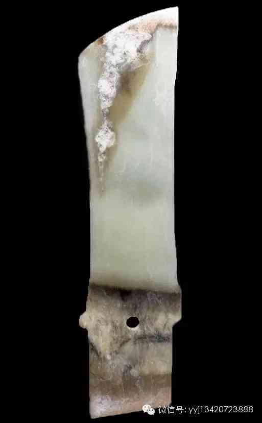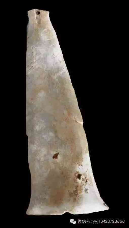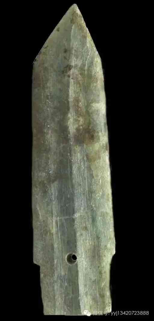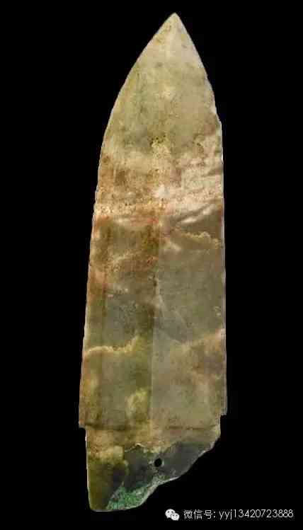西周 青綠玉石戈。雜然斑駁的青灰綠色玉石。琢一小戈,中脊與邊線明顯。約在援與內(nèi)之間,有一小穿。平素?zé)o紋。最寬1.95公分 長7.4公分 最厚0.5公分。