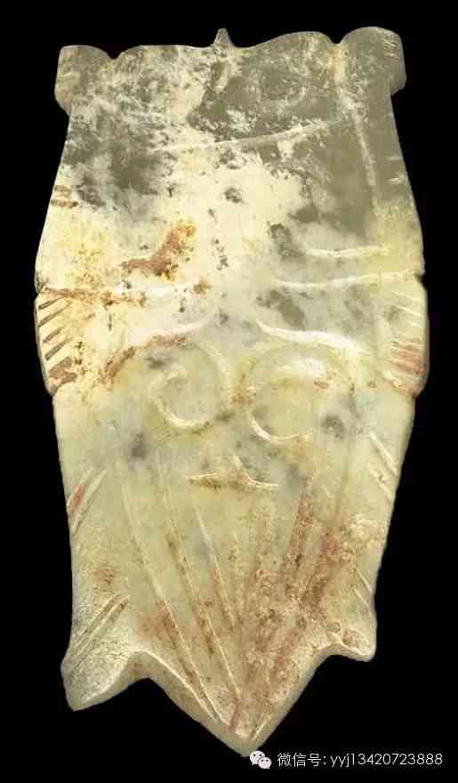 商晚至西周早 蟬形佩。綠色玉,部分白化。蟬頂作「介」字結(jié)構(gòu),橫鉆一小孔。雙面都有紋飾,雙眼下琢兩個回字形,腹成三角形,內(nèi)填漩渦紋,兩側(cè)雕平行線。長3.9公分 寬2.1公分 厚0.54公分。