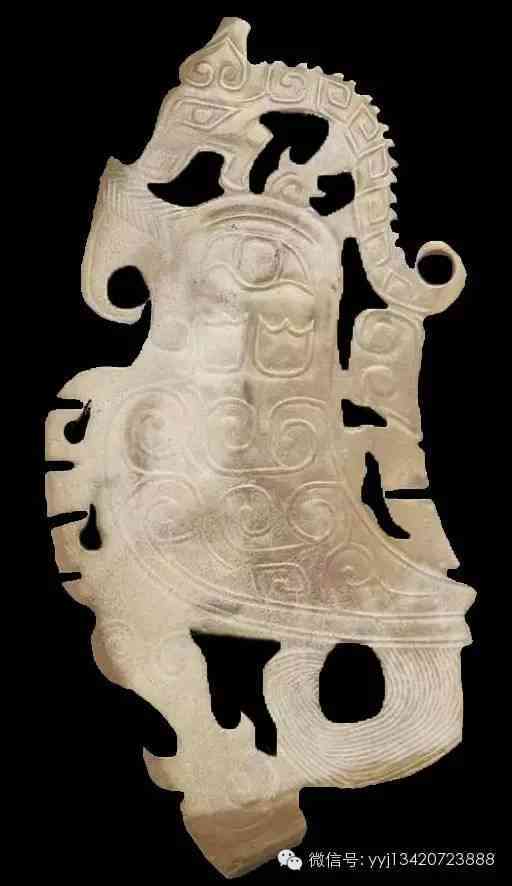 西周 鏤空龍鳳紋玉珮。白色玉,帶淺赭斑。鏤空龍鳳紋,單面凸雕簡單的線條裝飾,中心一人首的側(cè)影。中央鉆有一小孔。4.9公分x3公分x0.4公分 。